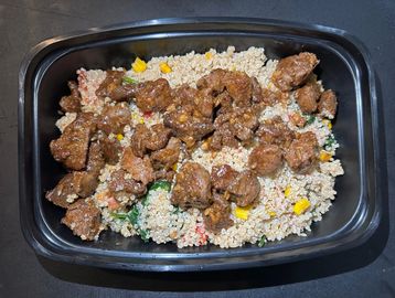 Enjoy a delicious serving of organic fried rice made with organic ingredients like peas, carrots, and pasture-raised eggs, along with organic snow peas, all topped with grass-fed sirloin. This dish is perfect for those seeking healthy meals and nutritious meal options.