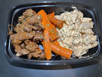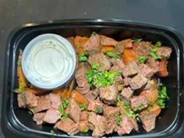 This healthy meal option features a low carb alternative that maintains the potato feel using roasted organic radishes and roasted organic carrots, all topped with grilled grass-fed top sirloin. To enhance the flavors, it comes with a side of lemon lime infused sour cream.