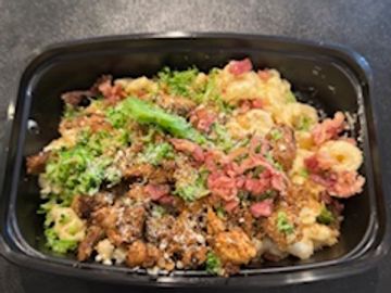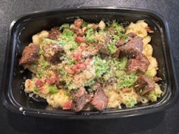 A simple roasted garlic 5 cheese Mac made with organic ingredients, topped with minced organic broccoli, grass fed parmesan cheese, organic bread crumbs, antibiotic/hormone free bacon, and grilled grass fed top sirloin, offers a delicious option for healthy meals.