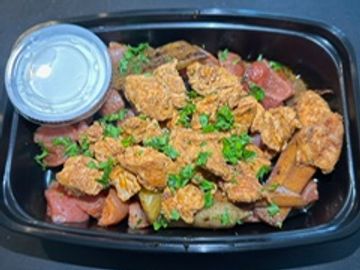 Enjoy a healthy meal featuring seasoned organic quinoa topped with homemade buffalo sauce and marinated free-range chicken breast, complemented by marinated tomatoes, slaw mix, and a side of homemade tzatziki sauce. This dish highlights the best organic ingredients while offering delicious meal options.