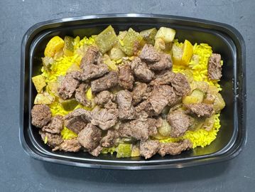 Enjoy a delicious grass fed sirloin served on a bed of rice, topped with homemade fajita sauce made from organic ingredients like bell peppers, onions, jalapenos, and cilantro. This dish is one of the best healthy meals among various meal options.