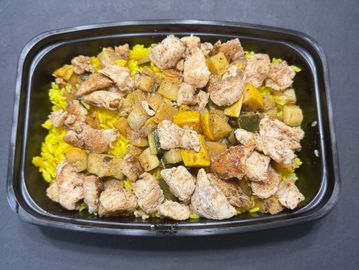 Enjoy a delicious and healthy meal featuring free range chicken breast served on a bed of organic turmeric yellow rice, accompanied by organic grilled zucchini and squash. This meal options also includes a refreshing side of chipotle cilantro lime slaw and a vibrant charred corn mango salsa.