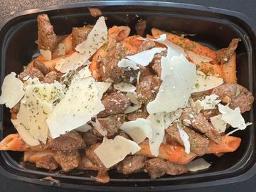 Enjoy a deliciously authentic creamy marinara sauce tossed with organic penne pasta, topped with grass-fed beef meatballs and organic shaved parm cheese, making it one of the best healthy meals and meal options for those who appreciate organic ingredients.