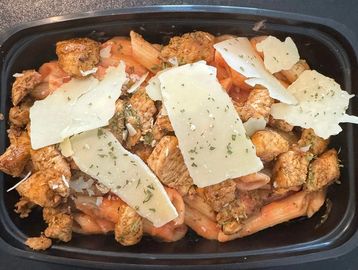 Enjoy a deliciously authentic creamy marinara sauce tossed with organic penne pasta, topped with free-range chicken meatballs and organic shaved parm cheese, making it one of the best healthy meal options for those who appreciate organic ingredients.