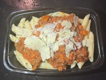 A classic meat sauce made with organic ingredients like garlic, onions, and carrots, served with penne pasta and topped with grass-fed parmesan cheese, makes for one of the healthiest meal options.