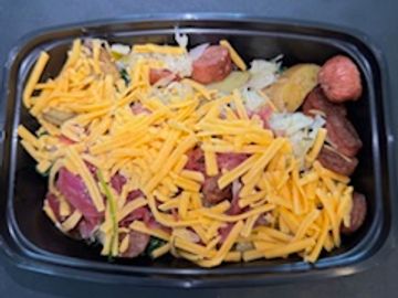 Grass fed beef pasture raised polish sausage grilled with yellow potatoes and spinach topped with sauerkraut, pickled red onions and cheddar cheese.